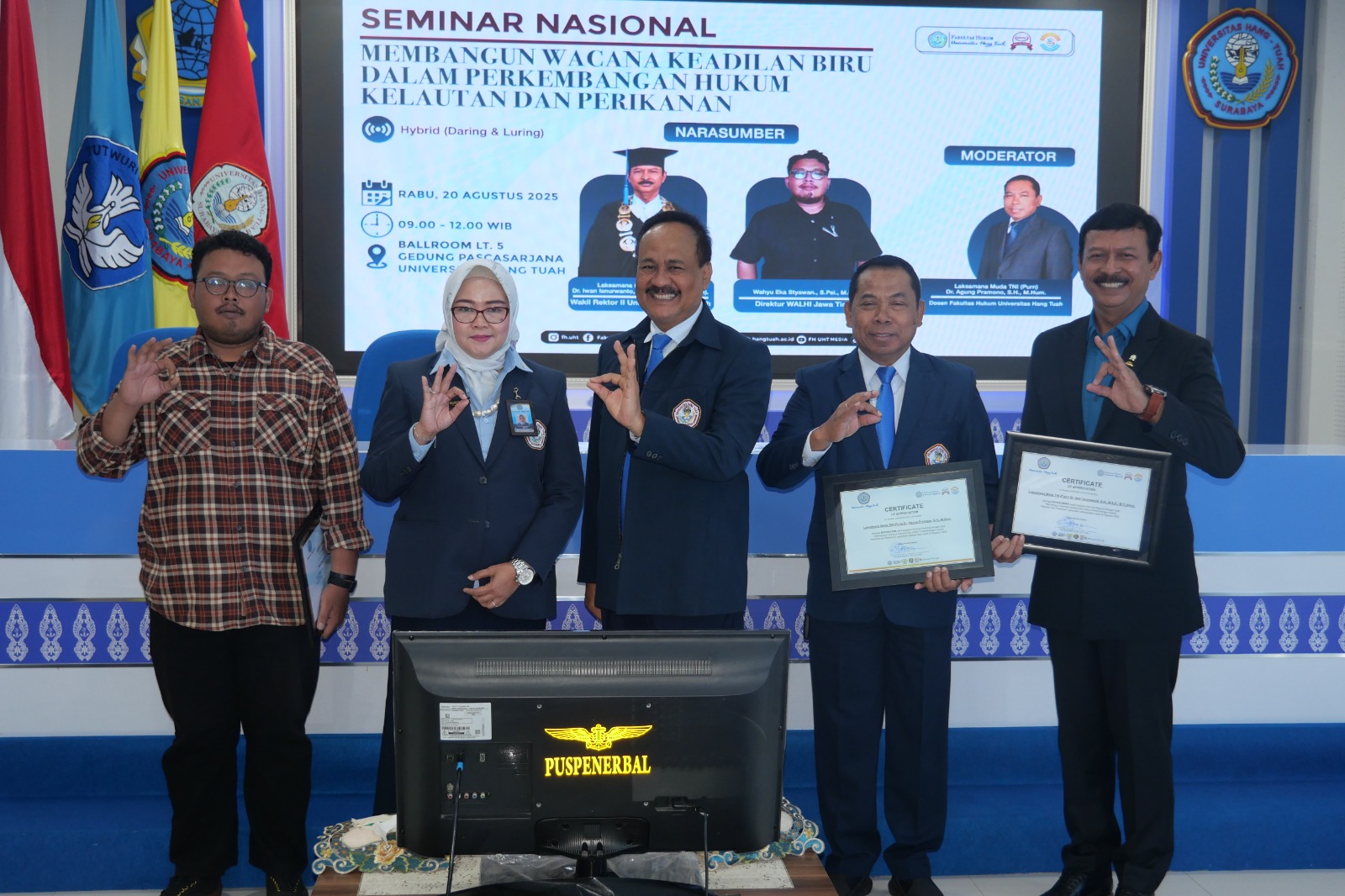 Surabaya, 20 Agustus 2025 — Fakultas Hukum Universitas Hang Tuah (UHT) menggelar seminar nasional bertajuk “Membangun Wacana Keadilan Biru dalam Perkembangan Hukum Kelautan dan Perikanan” di Ballroom Gedung Pascasarjana UHT, Rabu (20/8). Acara ini menjadi forum strategis untuk membahas paradigma baru pembangunan maritim yang berkeadilan, berkelanjutan, dan inklusif, dengan melibatkan akademisi, praktisi hukum, pegiat lingkungan, serta instansi pertahanan dan kemaritiman.