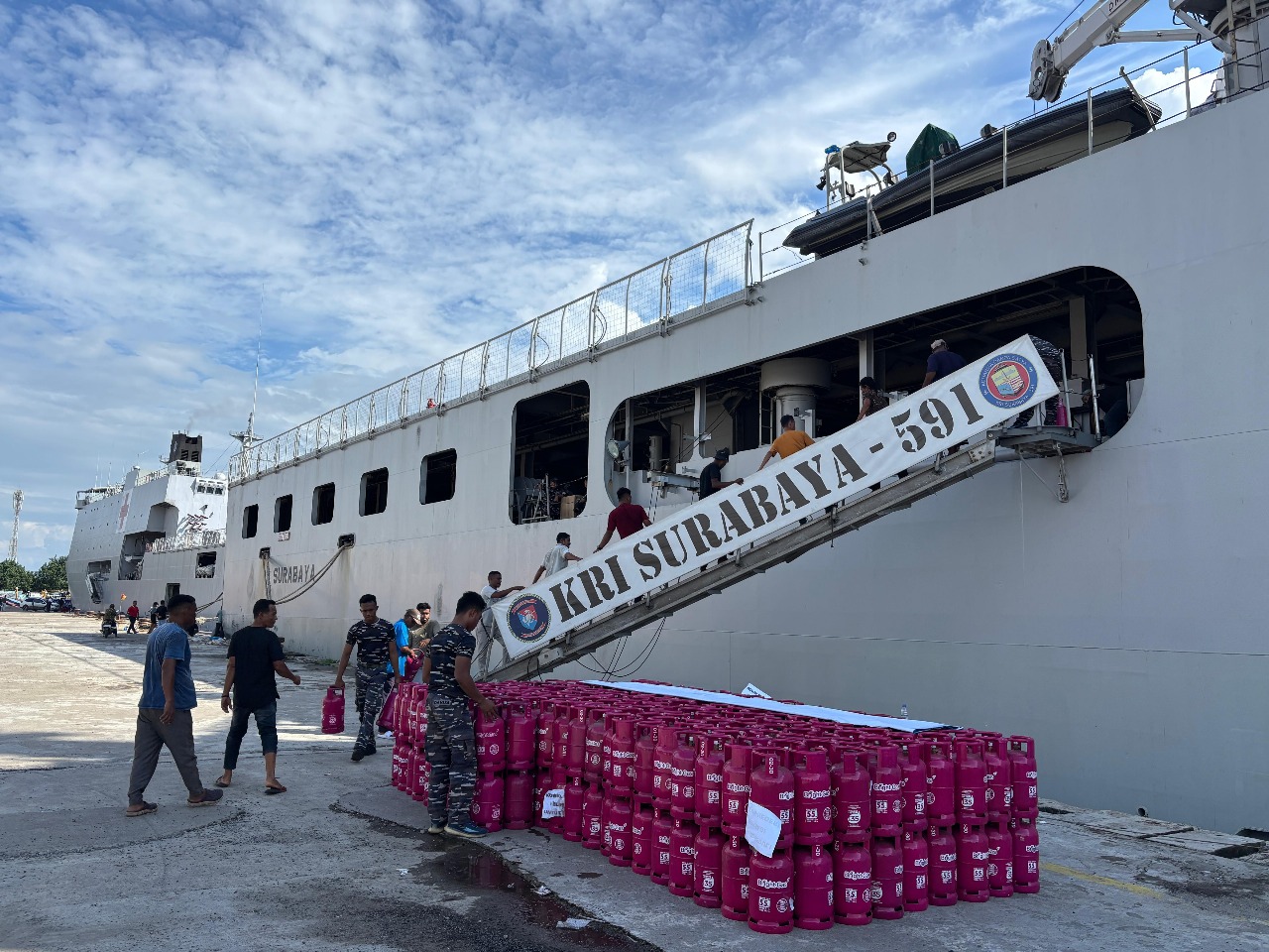 Setibanya di dermaga, KRI Surabaya-591 langsung melaksanakan debarkasi muatan bantuan. Bantuan kemanusiaan tersebut merupakan bagian dari penyaluran tahap kedua hasil kolaborasi Kementerian Pertanian (Kementan), Badan Pangan Nasional (Bapanas), Kemhan, Jalasenastri, Kowal, serta sejumlah mitra strategis lainnya.
