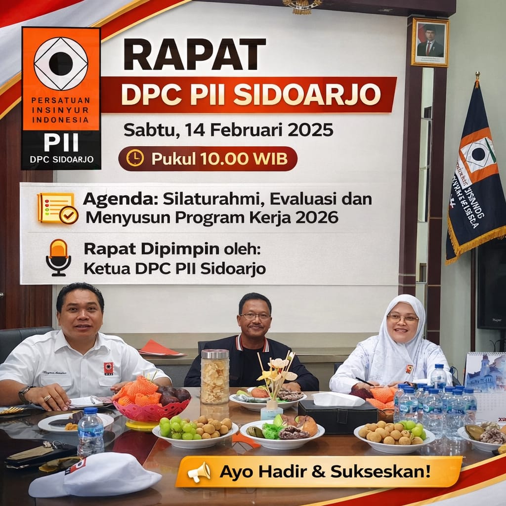 Rapat yang berlangsung di ruang pertemuan PC PII Sidoarjo tersebut dipimpin langsung oleh Ketua PC PII Sidoarjo, Ir. Sugiono Adi Salam, M.M., IPU., ACPE dan dihadiri jajaran pengurus serta anggota.