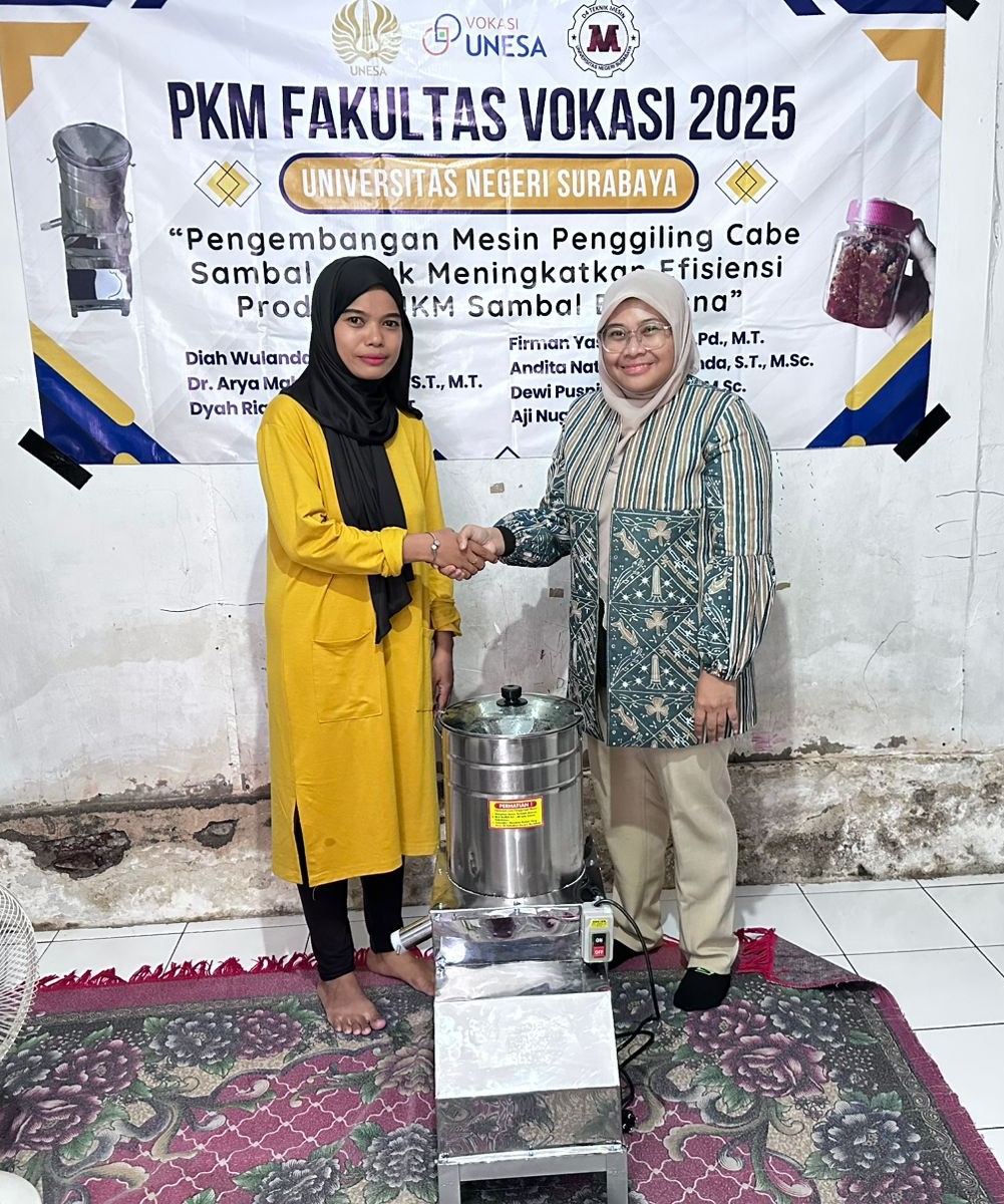 SURABAYA, Detik Berita 1 – Sebagai bagian dari komitmen Universitas Negeri Surabaya (Unesa) dalam mendukung kemajuan UMKM lokal, tim Dosen Fakultas Vokasi Unesa mengimplementasikan program Pengabdian kepada Masyarakat (PkM) di UKM Sambal Bu Misna. Program ini bertujuan untuk meningkatkan efisiensi proses produksi sambal dengan mengembangkan mesin penggiling cabe semi-otomatis yang dapat meningkatkan kapasitas produksi secara signifikan.