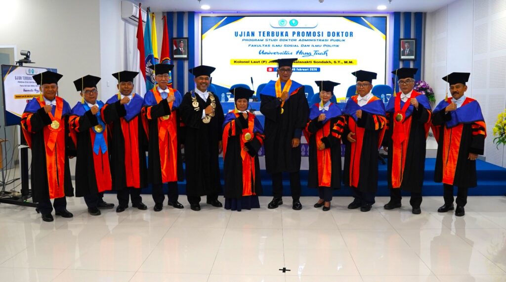Vip-Surabaya – Program Doktoral Administrasi Publik Fakultas Ilmu Sosial dan Ilmu Politik (FISIP) Universitas Hang Tuah (UHT) kembali mencetak lulusan doktor. John David Nalasakti Sondakh, S.T., M.M. resmi meraih gelar Doktor Administrasi Publik setelah menjalani sidang disertasi pada Minggu (8/2/2026) di Gedung Pascasarjana Universitas Hang Tuah lantai 5.